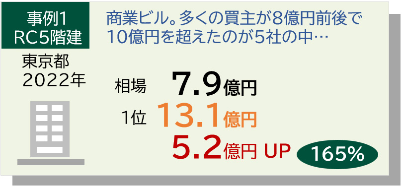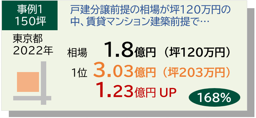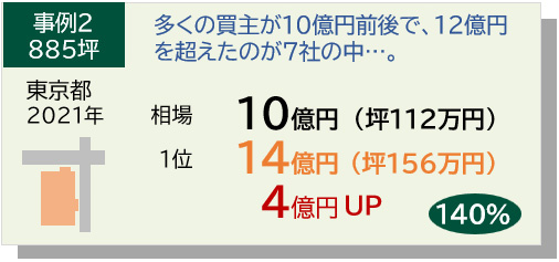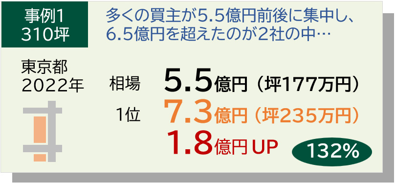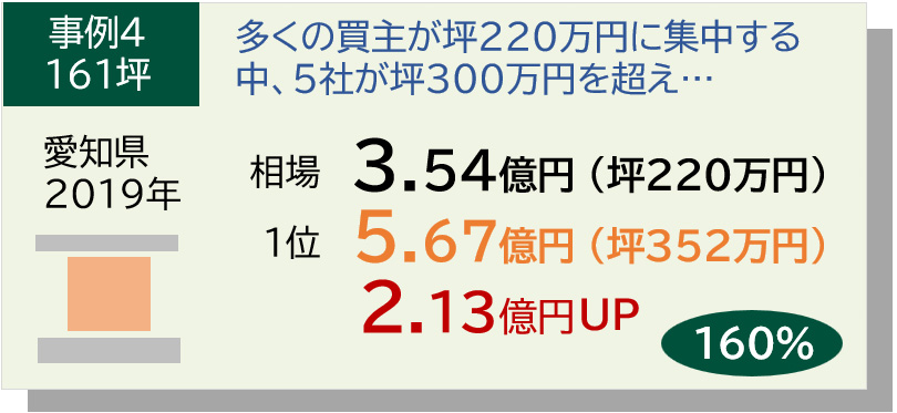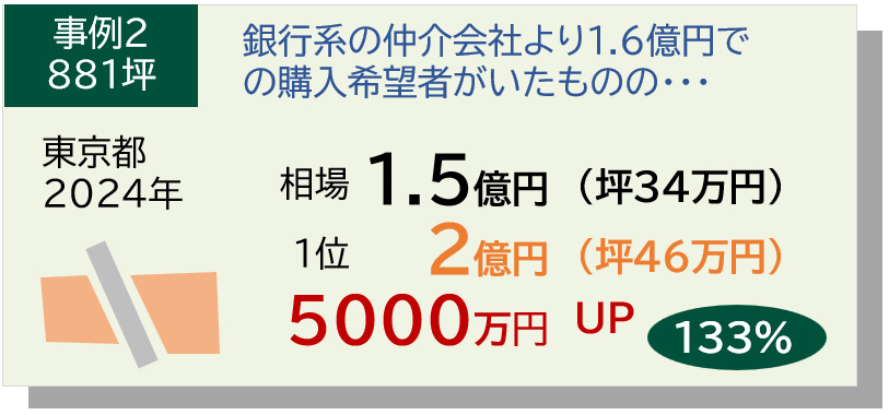 1.7億円以上の買主が複数いることが1週間で判明(10社中9社の買主に情報が入っていなかった)。入札を実施したところ、地元の戸建て分譲会社が4000万円上の2億円で落札。 -