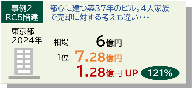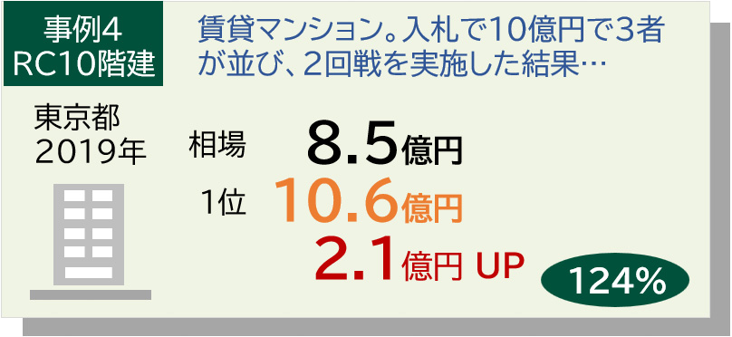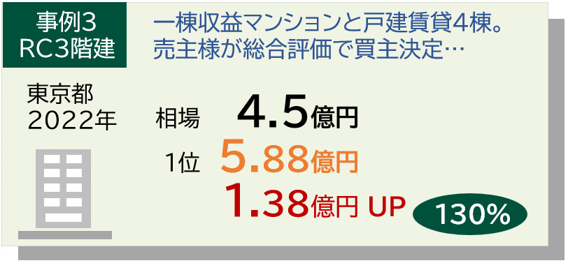 他を突き放して高値をつけた買主が2社いて、2回戦も実施したがそこでも僅差だった。最終、売主様のお考えに近い買主を総合評価で選ばれ、喜ばれた。 -