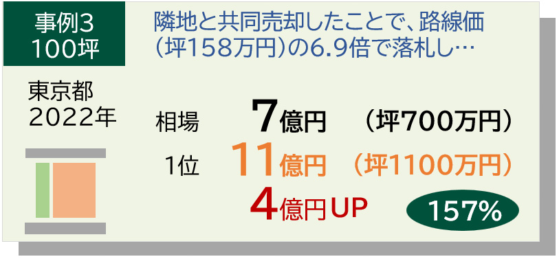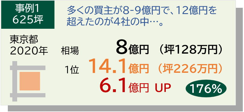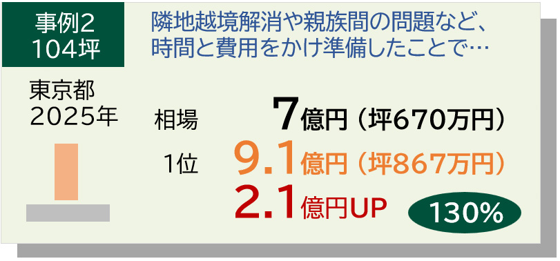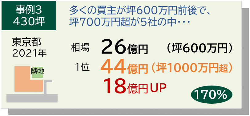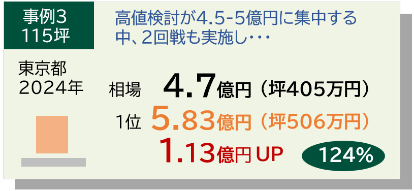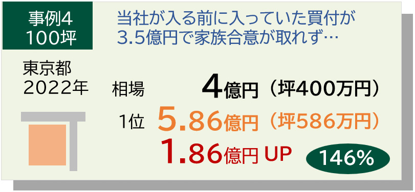 売り急ぐ共有者がいる中、3.5億円では売らず、当社で入札実施。4.7億円(坪470万円)を超えた買主が11社いる中、5.86億円で落札。売主4名とも納得され、円満売却となった。
