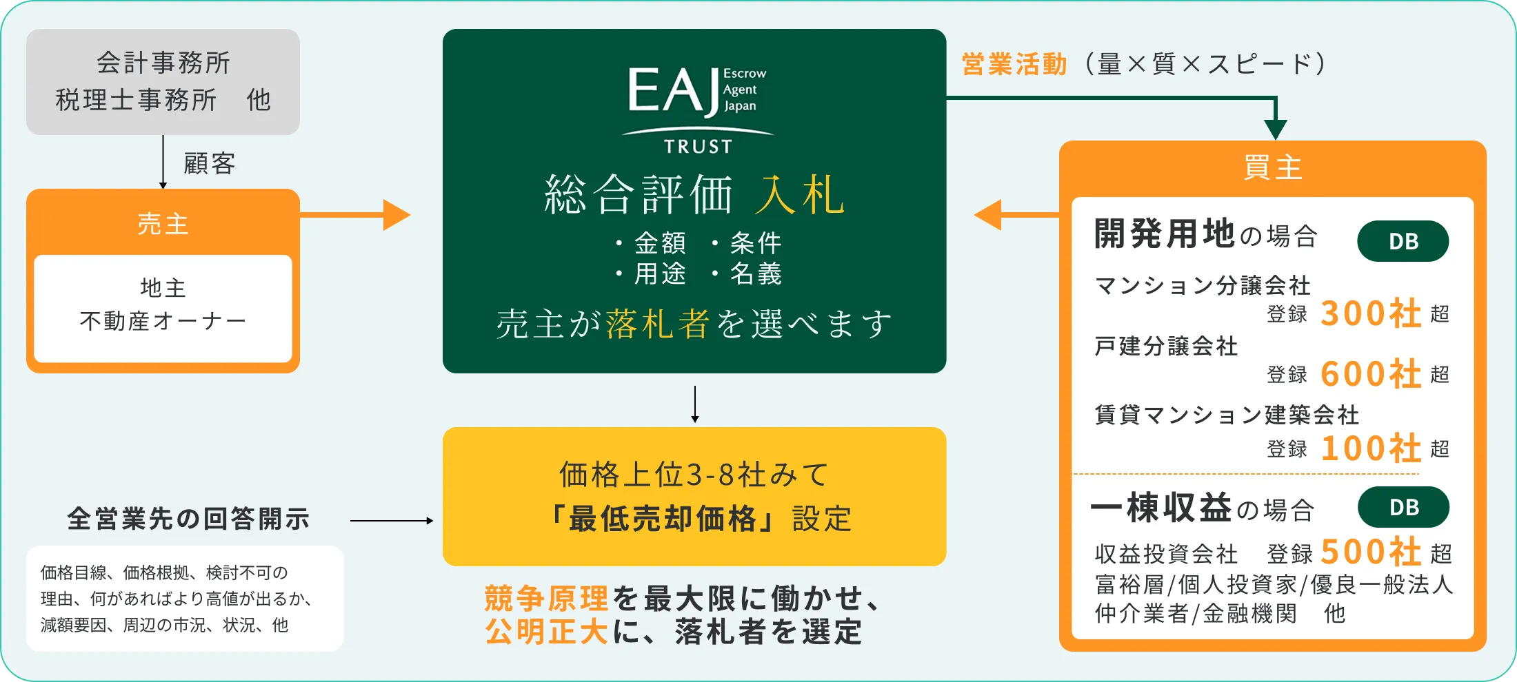 数億円規模の不動産を真に高値で売却するには、単純な入札だけでは不十分です。当社の不動産オークションサービスは、⻑年かけて築き上げた、高値・好条件を引き出すための「仕組み」を有しています。
